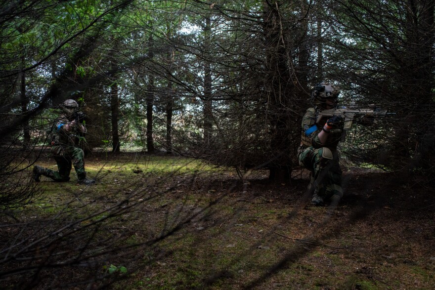 Kneeling in a tree line on a foggy morning in Canby, Oregon, Alex Bates and Andrew Pollmann are scanning the woods for potential threats.