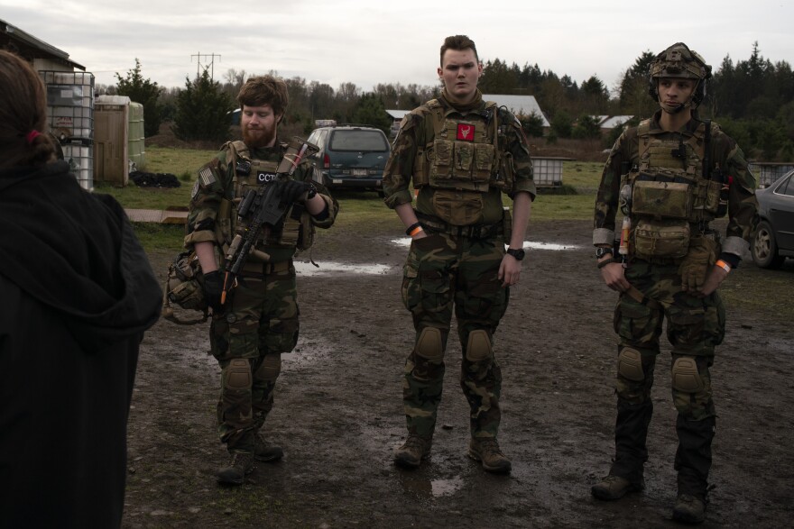 Noah Wenger, Andrew Pollmann, and Alex Bates listen to the rules before playing an AirSoft game at Action Acres AirSoft on March 23, 2019, in Canby, Oregon.