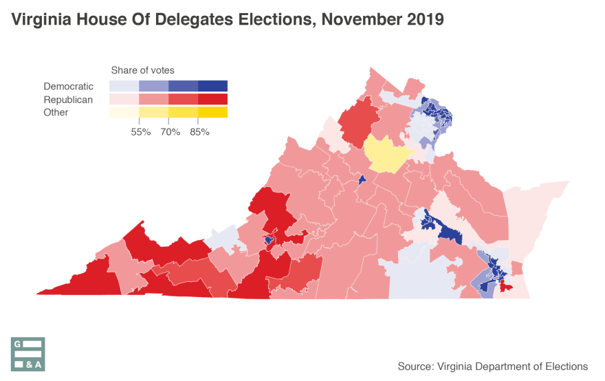 Results From The Tuesday, Nov. 5, 2019 Election: Democrats flipped key districts in Virginia and took control of both the Senate and the House of Delegates. This map of Virginia shows what party won the election in each of the 100 districts for Virginia’s House of Delegates.