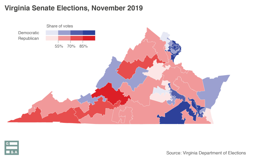 Results From The Tuesday, Nov. 5, 2019 Election: Democrats flipped key districts in Virginia and took control of both the Senate and the House of Delegates. This map of Virginia shows what party won the election in each of the 40 State Senate districts.